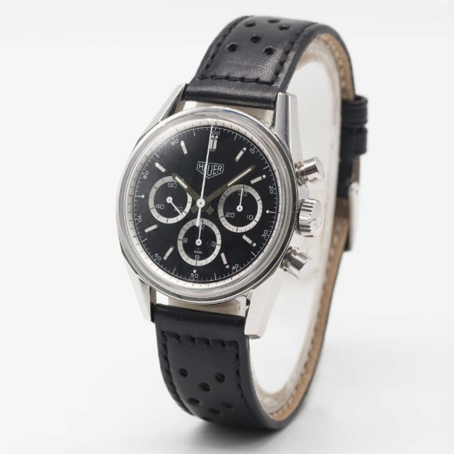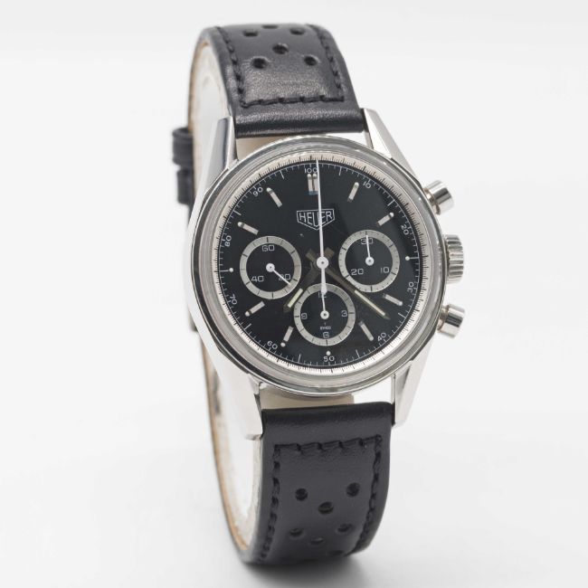 Movement: 18J, manual wind, Lemania cal. 1873, signed Heuer, numbered.
