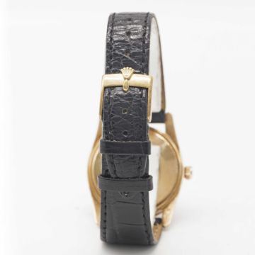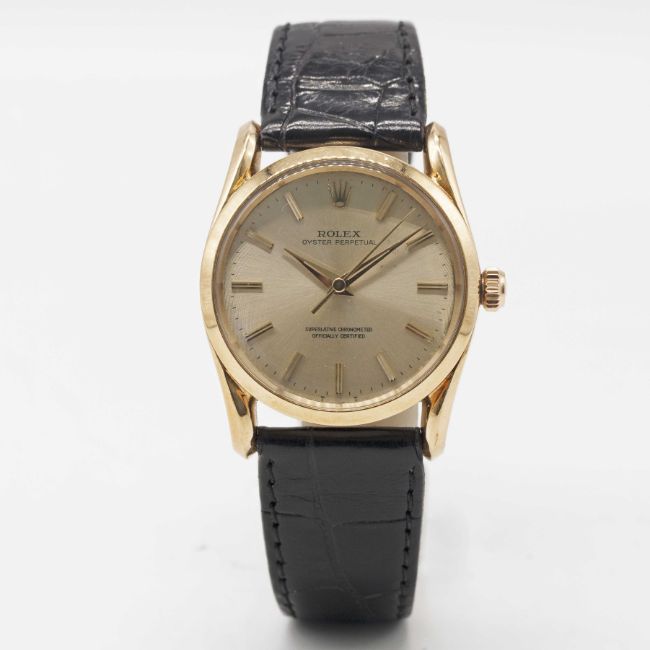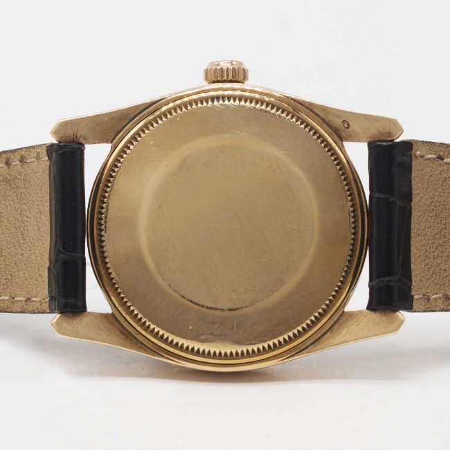 Case: Diameter approx. 33mm, Oyster case with "bombe" lugs, signed Montres Rolex S.A., 14k hallmarks, numbered 1,3xx,xxx (faint), Rolex crown.