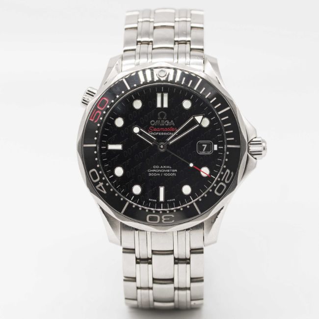 Case: Diameter approx. 41mm, partial exhibition case back with gun barrel design & rotating "bullet" to centre, limited edition number, 60 minute rotating ceramic bezel, helium escape value, Omega crown.Bracelet: Original Omega bracelet, numbered 62/1515/816.