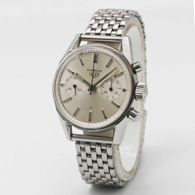 Case: Diameter approx. 36mm, screw back, signed Heuer-Leonidas SA, numbered 76,xxx, Heuer crown.