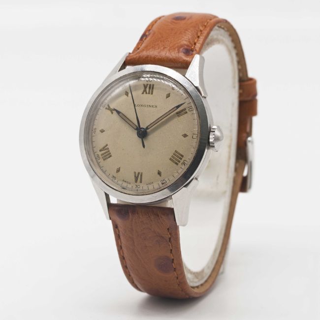 Case: Diameter approx. 35mm, screw back, light inscription to case back, signed Longines.