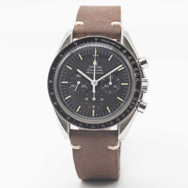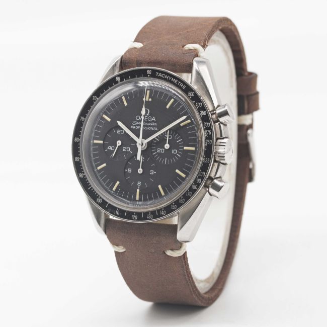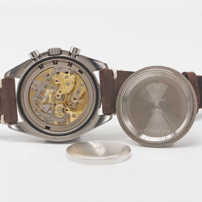 Case: Diameter approx. 42mm, screw back, Speedmaster emblem embossed with NASA moon landing tribute, signed Omega Watch Co, dust cover, tachymetre bezel, Omega crown.