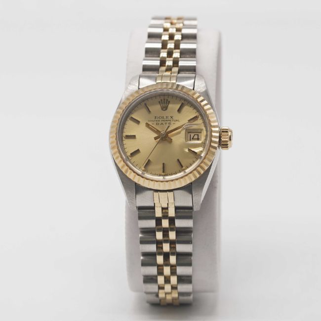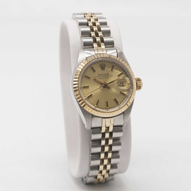 A LADIES STEEL & GOLD ROLEX OYSTER PERPETUAL DATE BRACELET WATCH