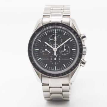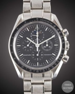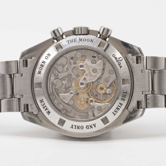Case: Diameter approx. 42mm, screw back, sapphire exhibition back with engraving to edge 'The First And Only Watch Worn On The Moon', signed Omega, numbered 77,xxx,xxx, tachymetre bezel, Omega crown.