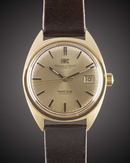 A GENTLEMAN'S 18K SOLID GOLD IWC YACHT CLUB AUTOMATIC WRIST WATCHCIRCA 1970Movement: Automatic, cal. 8541B, signed International Watch Co, numbered 2,0xx,xxx. Case: Width approx. 36mm, screw back, signed International Watch Co, numbered 1,9xx,xxx, 18k hallmarks, IWC crown.Strap: Leather.CONDITION REPORTDial: Original dial in excellent condition, showing small signs of age.Movement: Running at present.Case: In very good condition, with some light scratches due to general use.Strap/Bracelet: In good condition.The timekeeping and accuracy of this watch has not been tested, therefore cannot be guaranteed.