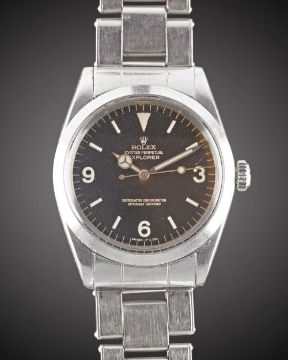 A RARE GENTLEMAN'S STAINLESS STEEL ROLEX OYSTER PERPETUAL EXPLORER BRACELET WATCHCIRCA 1966, REF. 1016 WITH GLOSS BLACK GILT DIAL TURNING BROWNMovement: 26J, automatic chronometer, cal. 1560, signed Montres Rolex S.A., numbered.Case: Diameter approx. 36mm, Oyster case, signed Montres Rolex S.A., dated IV.65, numbered 1,2xx,xxx, Rolex crown.Bracelet: Original Rolex Oyster riveted bracelet, numbered 7206/80, dated 3.66.CONDITION REPORTDial: Original dial in very good condition, turning a "chocolate" brown colour due to age.Movement: Running at present.Case: In good condition, with small scratches & light wear due to general use.Strap/Bracelet: In good condition, with light scratches & some wear to the links due to general use.The timekeeping and accuracy of this watch has not been tested, therefore cannot be guaranteed.
