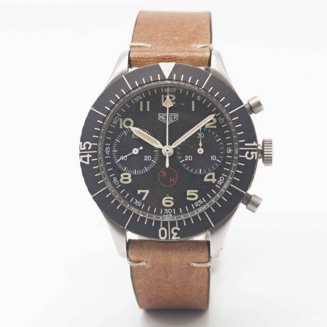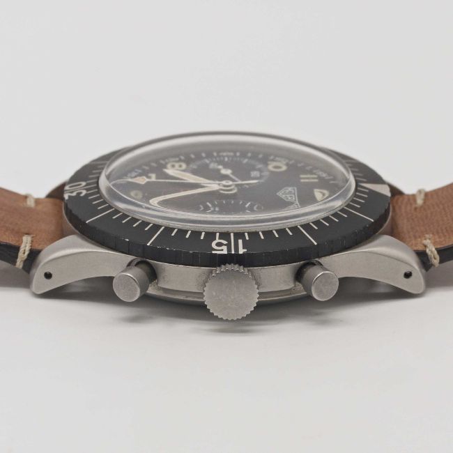 A GENTLEMAN'S STAINLESS STEEL GERMAN MILITARY HEUER "BUND" FLYBACK CHRONOGRAPH WRIST WATCHCIRCA 1970, REF. 1550 SG WITH (3 H) DIAL Movement: 17J, manual wind, Valjoux cal. 230.Case: Diameter approx. 43mm, "clamshell" type case with four screws, numbered 93,xxx, issue markings BUND 6645-12-146-3774, 60 minute rotating bezel.Strap: Leather.CONDITION REPORTDial: Original dial in very good condition, showing some signs of age.Movement: Running at present.Case: In excellent condition, with some light scratches due to general use.Strap/Bracelet: In excellent condition.The timekeeping and accuracy of this watch has not been tested, therefore cannot be guaranteed.