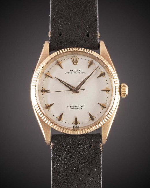 A RARE GENTLEMAN'S 18K SOLID ROSE GOLD ROLEX OYSTER PERPETUAL WRIST WATCHCIRCA 1955, REF. 6567 SILVER "OCC" DIAL WITH "KITE" MARKERS & DAUPHINE HANDSMovement: 25J, automatic chronometer, "butterfly" rotor, cal. 1030, signed Montres Rolex S.A., numbered.Case: Diameter approx. 34mm, Oyster case, signed Montres Rolex S.A., numbered 89,xxx, 18k hallmarks, finely fluted bezel, Rolex Brevet crown.Strap: Suede.CONDITION REPORTDial: Original dial in excellent condition.Movement: Running at present.Case: In excellent condition, with some light scratches due to general use.Strap/Bracelet: In excellent condition.The timekeeping and accuracy of this watch has not been tested, therefore cannot be guaranteed.