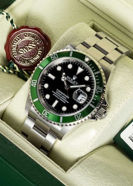 A GENTLEMAN'S STAINLESS STEEL ROLEX OYSTER PERPETUAL DATE "ANNIVERSARY" SUBMARINER BRACELET WATCHDATED 2005, REF. 16610LV "KERMIT" WITH ORIGINAL BOX, GUARANTEE, BOOKLETS & TAGSMovement: Automatic chronometer, quick-set date, signed Rolex, numbered.Case: Diameter approx. 40mm, Oyster case, signed Montres Rolex S.A., D serial no., 60 minute rotating green bezel, sapphire crystal, Rolex triplock crown.Bracelet: Original Rolex Oyster Submariner bracelet, numbered MA2/93250.CONDITION REPORTDial: Original dial in excellent condition.Movement: Running at present.Case: In excellent condition, with some light scratches due to general use.Strap/Bracelet: In excellent condition.The timekeeping and accuracy of this watch has not been tested, therefore cannot be guaranteed.