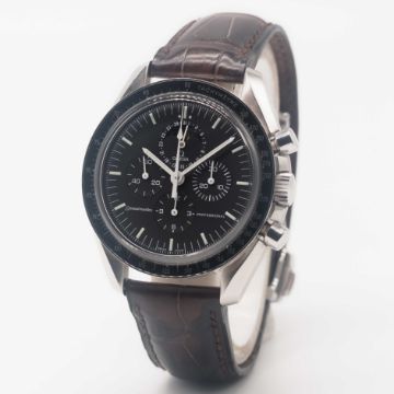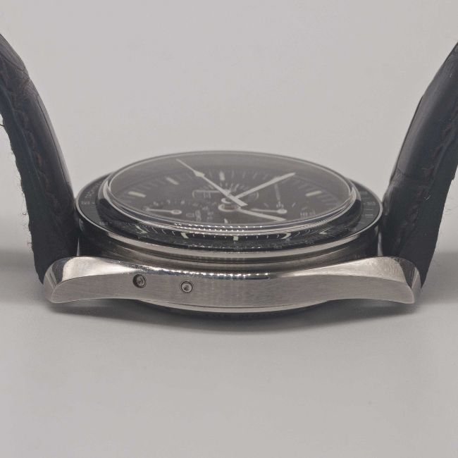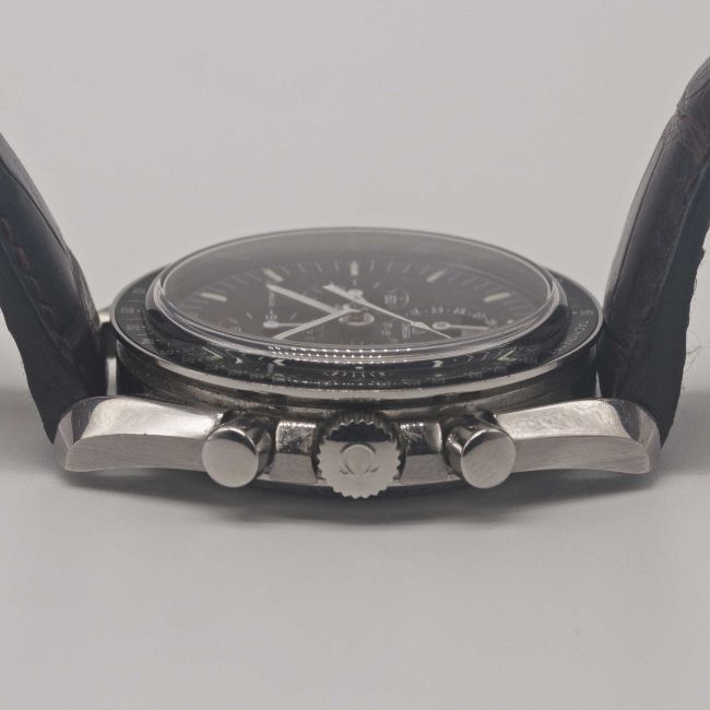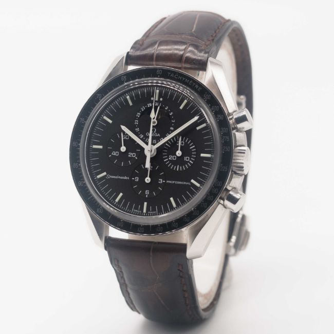 A GENTLEMAN'S STAINLESS STEEL OMEGA SPEEDMASTER PROFESSIONAL MOONPHASE CHRONOGRAPH WRIST WATCHCIRCA 2005, REF. 3576.50.00Movement: 18J, manual wind, cal. 1866, signed Omega, numbered 77,xxx,xxx. Case: Diameter approx. 42mm, screw back, sapphire exhibition back with engraving to edge 'The First And Only Watch Worn On The Moon', signed Omega, numbered 77,xxx,xxx, tachymetre bezel, Omega crown.Strap: Omega leather strap & deployment clasp.CONDITION REPORTDial: Original dial in excellent condition.Movement: Running at present.Case: In very good condition, with some light scratches due to general use.Strap/Bracelet: In fair condition, deployment clasp in good condition.The timekeeping and accuracy of this watch has not been tested, therefore cannot be guaranteed.