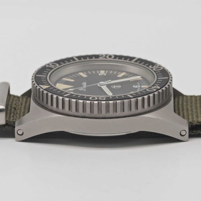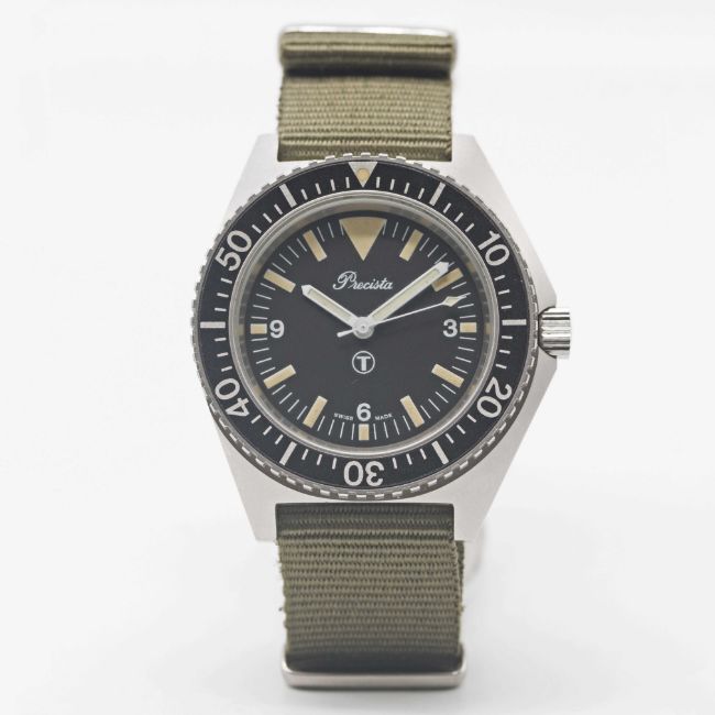 A RARE GENTLEMAN'S STAINLESS STEEL BRITISH MILITARY PRECISTA ROYAL NAVY DIVERS WRIST WATCHDATED 1993, WITH "BIG TRIANGLE" TRITIUM DIALMovement: Quartz.Case: Diameter approx. 39mm, asymmetric, fixed bars, screw back, issue markings 6645-99-757-3314 119/93 ^, 60 minute rotating bezel, screw-down crown.Strap: NATO.CONDITION REPORTDial: Original dial in excellent condition.Movement: Working at present.Case: In excellent condition, with some small scratches due to general use.Strap/Bracelet: In excellent condition.