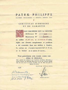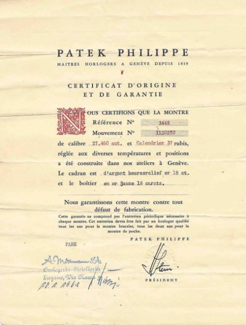 A GENTLEMAN'S 18K SOLID GOLD PATEK PHILIPPE CALATRAVA AUTOMATIC WRIST WATCHCIRCA 1960s, REF. 3445 WITH ORIGINAL BOX & PAPERWORKMovement: 37J, automatic, cal. 27-460M, signed Patek Philippe & Co., numbered 1,1xx,xxx.Case: Diameter approx. 35mm, screw back, signed Patek Philippe & Co., 18k hallmarks, numbered 31x,xxx, Patek Philippe crown.Strap: Leather.CONDITION REPORTDial: Original dial in fair condition, showing some small signs of age, light dents in the dial around 11 o'clock from the dial feet.Movement: Running at present.Case: In very good condition, with some light scratches due to general use.Strap/Bracelet: In very good condition.The timekeeping and accuracy of this watch has not been tested, therefore cannot be guaranteed.