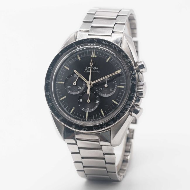 A VERY RARE GENTLEMAN'S STAINLESS STEEL OMEGA SPEEDMASTER "PRE MOON" CHRONOGRAPH BRACELET WATCHDATED 1964, REF. S 105.012-63 WITH BLUE "SOLEIL" DIAL, ACCOMPANIED BY ORIGINAL PLEXIGLASS (CRACKED) & OMEGA EXTRACT OF THE ARCHIVES SHOWING DELIVERY TO ITALY & CONFIRMING "LIGHT SILVERED-BLUE SUNBRUSHED" DIALMovement: 17J, manual wind, cal. 321, signed Omega Watch Co, numbered 20,xxx,xxx.Case: Diameter approx. 42mm, screw back, Speedmaster emblem on case back, signed Omega Watch Co, dust cover, "DON" tachymetre bezel faded to grey/blue, Omega crown.Bracelet: Original Omega flat-link bracelet, numbered 7912/16, dated 1.64.CONDITION REPORTDial: Dial in excellent condition, showing small signs of age.Movement: Running at present.Case: In very good condition, with some small scratches due to general use, some scratches to case back due to opening.Strap/Bracelet: In good condition, with some light scratches & wear due to general use.The timekeeping and accuracy of this watch has not been tested, therefore cannot be guaranteed.