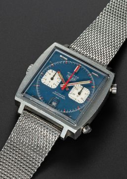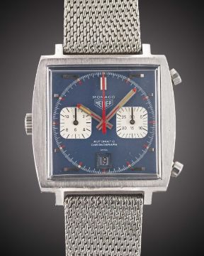 A GENTLEMAN'S STAINLESS STEEL HEUER MONACO "STEVE MCQUEEN" AUTOMATIC CHRONOGRAPH BRACELET WATCHCIRCA 1970s, REF. 1133B THE SAME MODEL WORN BY THE ACTOR STEVE MCQUEEN IN THE 1971 FILM 'LE MANS'Movement: 17J, automatic, signed Heuer.Case: Width approx. 40mm, Heuer emblem & tool no. 033 to outer case back, signed Heuer-Leonidas S.A. on inside, numbered 16x,xxx, Heuer crown & pushers.Bracelet: Stainless steel Milanese bracelet, maker's mark FBG.CONDITION REPORTDial: Original dial in excellent condition, showing some small signs of age.Movement: Running at present.Case: In very good condition, with small scratches due to general use.Strap/Bracelet: In good condition, with some light scratches & kinks due to general use.The timekeeping and accuracy of this watch has not been tested, therefore cannot be guaranteed.