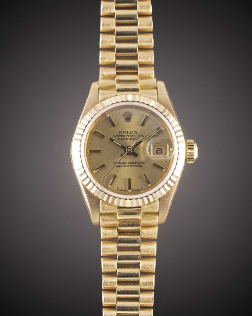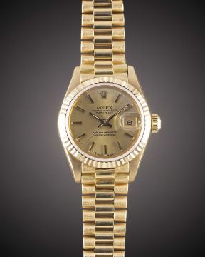 A LADIES 18K SOLID GOLD ROLEX OYSTER PERPETUAL DATEJUST BRACELET WATCHCIRCA 1985, REF. 69178 WITH CHAMPAGNE DIALMovement: 29J, automatic chronometer, cal. 2135, quick-set date, signed Rolex S.A., numbered.Case: Diameter approx. 26mm, Oyster case, signed Montres Rolex S.A., numbered 9,0xx,xxx, 18k hallmarks, solid gold fluted bezel, sapphire crystal, Rolex crown.Bracelet: Original 18k solid gold Rolex President bracelet.CONDITION REPORTDial: Original dial in excellent condition.Movement: Running at present.Case: In excellent condition, with some light scratches due to general use.Strap/Bracelet: In excellent condition, with some light scratches due to general use.The timekeeping and accuracy of this watch has not been tested, therefore cannot be guaranteed.