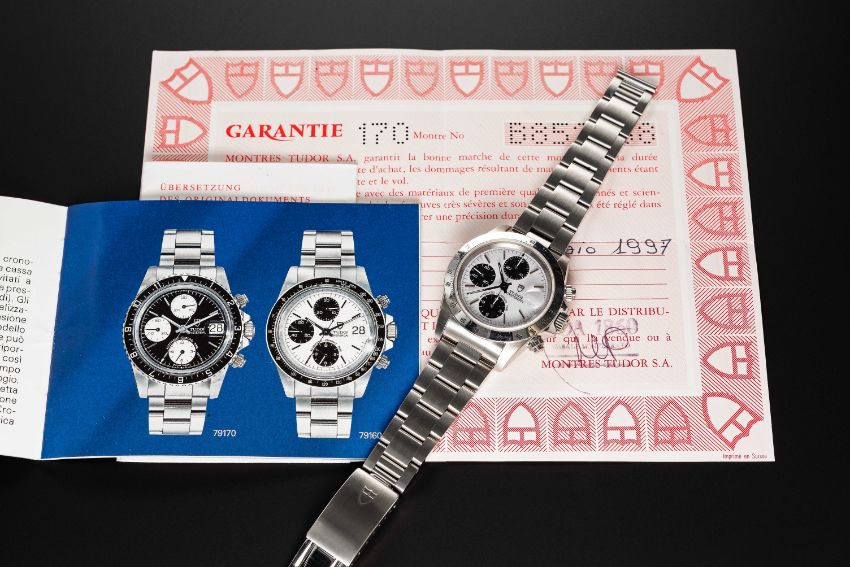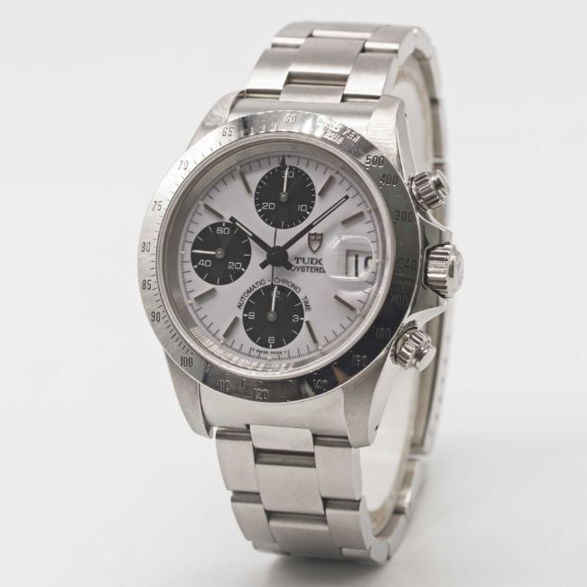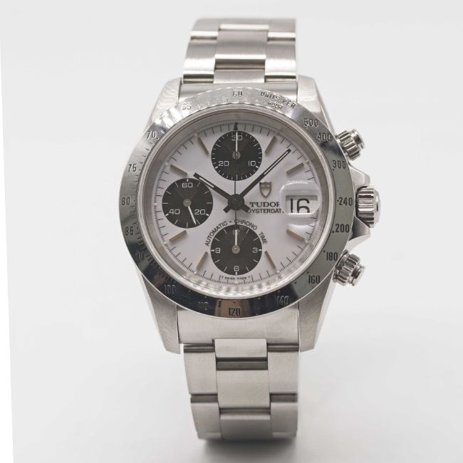 A GENTLEMAN'S STAINLESS STEEL ROLEX TUDOR OYSTERDATE AUTOMATIC CHRONO TIME CHRONOGRAPH BRACELET WATCHDATED 1997, REF. 79280 WITH WHITE "PORCELAIN" "PANDA" DIAL, ACCOMPANIED BY THE ORIGINAL GUARANTEE & BOOKLETMovement: 25J, automatic, base cal. 7750, signed Tudor Automatic-Prince.Case: Diameter approx. 40mm, Oyster case, signed Montres Tudor S.A., numbered B85x,xxx, steel units per hour bezel, Rolex Triplock crown & screw-down pushers.Bracelet: Original Rolex Tudor Oyster bracelet, numbered W8/78400/605.CONDITION REPORTDial: Original dial in excellent condition.Movement: Running at present.Case: In excellent condition.Strap/Bracelet: In excellent condition.The timekeeping and accuracy of this watch has not been tested, therefore cannot be guaranteed.