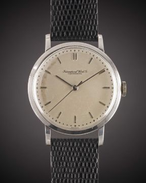A RARE GENTLEMAN'S PLATINUM IWC SCHAFFHAUSEN WRIST WATCHCIRCA 1960, KNOWN TO HAVE BEEN MADE FOR THE JAPANESE MARKETMovement: 17J, manual wind, cal. 89, signed International Watch Co, numbered 1,4xx,xxx. Case: Diameter approx. 35mm, snap back, signed International / IWC, numbered 1,4xx,xxx, Platinum hallmarks.Strap: Leather.CONDITION REPORTDial: Original dial in fair condition, showing signs of age.Movement: Running at present.Case: In very good condition, with some light scratches due to general use.Strap/Bracelet: In excellent condition.The timekeeping and accuracy of this watch has not been tested, therefore cannot be guaranteed.