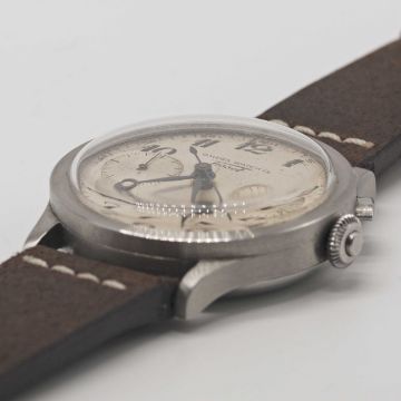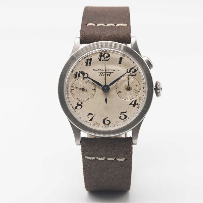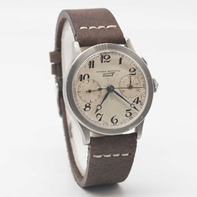A RARE GENTLEMAN'S LARGE SIZE STAINLESS STEEL OMEGA WATCH CO TISSOT "33.3" CHRONOGRAPH WRIST WATCHCIRCA 1940, CO-SIGNED DIAL WITH "BREGUET" NUMERALS & BLUE STEEL HANDSMovement: Manual wind, signed Omega Watch Co. Tissot, numbered 719. Case: Diameter approx. 37.5mm, flat bezel, snap back, numbered 34,xxx, "olive" pusher.Strap: Leather.CONDITION REPORTDial: Original dial in fair condition, showing signs of age.Movement: Running at present.Case: In very good condition, with some light scratches due to general use.Strap/Bracelet: In excellent condition.The timekeeping and accuracy of this watch has not been tested, therefore cannot be guaranteed.