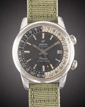 A GENTLEMAN'S STAINLESS STEEL ENICAR SHERPA SUPER JET GMT WRIST WATCHCIRCA 1960s, REF. 146/003 WITH BLACK DIALMovement: Automatic, signed Enicar. Case: Diameter approx. 40mm, super compressor, Seapearl emblem embossed on case back, signed Enicar Watch Co, numbered 72x,xxx, 24 hour inner rotating bezel, Enicar anti-slip crowns.Strap: Textile.CONDITION REPORTDial: Original dial in excellent condition.Movement: Running at present.Case: In fair condition, with scratches & wear due to general use.Strap/Bracelet: In excellent condition.The timekeeping and accuracy of this watch has not been tested, therefore cannot be guaranteed.
