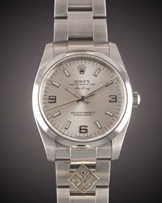 A GENTLEMAN'S STAINLESS STEEL ROLEX OYSTER PERPETUAL AIR KING "DOMINO'S" BRACELET WATCHDATED 2011, REF. 114200 WITH SILVER 3-6-9 DIAL, ACCOMPANIED BY THE ORIGINAL BOX, PAPERS & TAGS, SHOWING PURCHASE BY DOMINO'S PIZZAMovement: Automatic chronometer, signed Rolex S.A., numbered.Case: Diameter approx. 35mm, Oyster case, Domino's Pizza logo engraved on case back, signed Rolex S.A., G serial no., smooth bezel, sapphire crystal, Rolex crown.Bracelet: Original Rolex Oyster bracelet with Domino's Pizza logo embossed on link.CONDITION REPORTDial: Original dial in excellent condition.Movement: Running at present.Case: In excellent condition.Strap/Bracelet: In excellent condition, original stickers to outside of clasp.The watch looks to have rarely been worn.The timekeeping and accuracy of this watch has not been tested, therefore cannot be guaranteed.