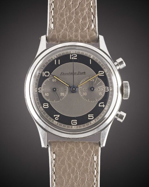 A RARE GENTLEMAN'S LARGE SIZE STAINLESS STEEL EXCELSIOR PARK "WATERPROOF" CHRONOGRAPH WRIST WATCHCIRCA 1960, WITH GREY & BLACK GLOSS DIAL & "HOOKED 7"Movement: Manual wind, Excelsior Park calibre EP4.Case: Diameter approx. 37.5mm, "bevelled" screw back, numbered 85x,xxx.Strap: Leather.CONDITION REPORTDial: Original dial in excellent condition.Movement: Running at present.Case: In good condition, with small scratches due to general use.Strap/Bracelet: In excellent condition.The timekeeping and accuracy of this watch has not been tested, therefore cannot be guaranteed.