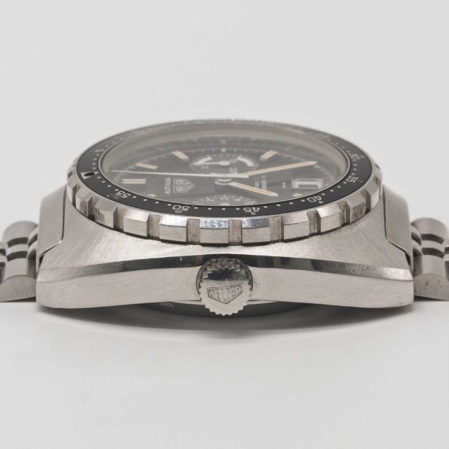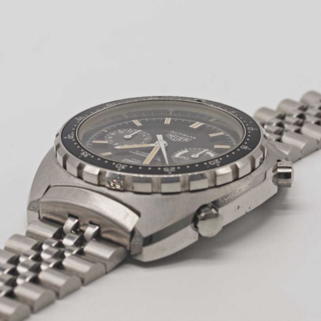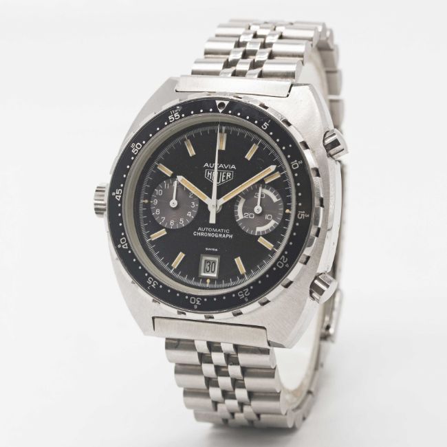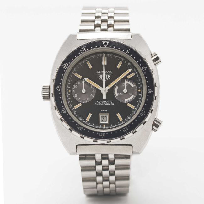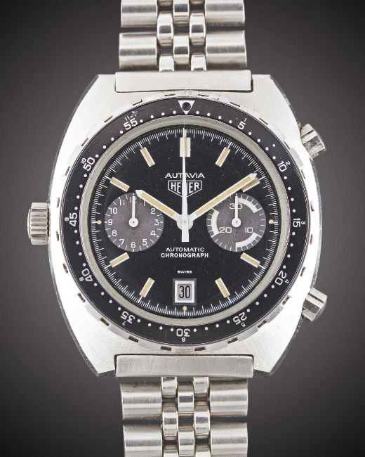 A GENTLEMAN'S STAINLESS STEEL HEUER AUTAVIA AUTOMATIC CHRONOGRAPH BRACELET WATCHCIRCA 1980s, REF. 11063V WITH GLOSS BLACK DIAL & GREY REGISTERSMovement: 17J, automatic, cal. 12, signed Heuer.Case: Width approx. 42mm, screw back, signed Heuer-Leonidas SA, patent numbers, signed M.R.P. S.A with case ref. 503.305, numbered 39x,xxx, MH rotating bezel, inscription to case back 'R 4182', mineral glass, Heuer crown & pushers.Bracelet: Original Heuer bracelet with flip-lock clasp.CONDITION REPORTDial: Original dial in excellent condition.Movement: Running at present.Case: In excellent condition, with some light scratches due to general use.Strap/Bracelet: In very good condition.The timekeeping and accuracy of this watch has not been tested, therefore cannot be guaranteed.