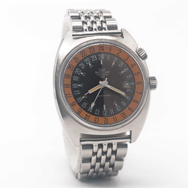 A GENTLEMAN'S STAINLESS STEEL GLYCINE AIRMAN SST "PUMPKIN" 24 HOUR AUTOMATIC BRACELET WATCHCIRCA 1970s, MADE TO MARK BOEING'S EARLY ATTEMPTS AT SUPER SONIC TRANSPORTATION (SST) WITH PRODUCTION OF THE BOEING 2707 PROTOTYPEMovement: Automatic.Case: Width approx. 42mm, compressor snap back, signed Glycine Airman SST with Boeing 2707 prototype embossed on case back, numbered 95x,xxx, anti-slip crowns.Bracelet: Stainless steel Expandro "BoR" bracelet.CONDITION REPORTDial: Original dial in good condition, showing some hand drag to centre of dial.Movement: Running at present.Case: In very good condition, with some small scratches due to general use.Strap/Bracelet: In very good condition.The timekeeping and accuracy of this watch has not been tested, therefore cannot be guaranteed.
