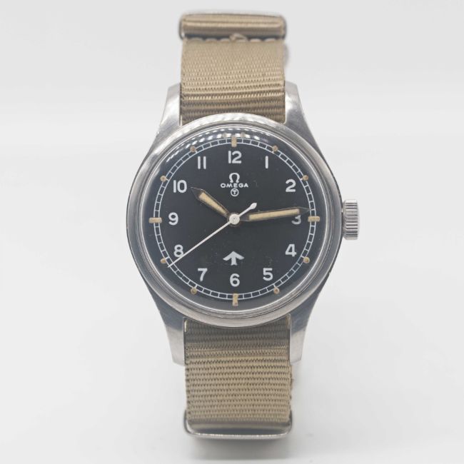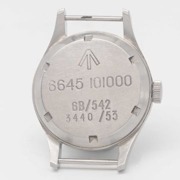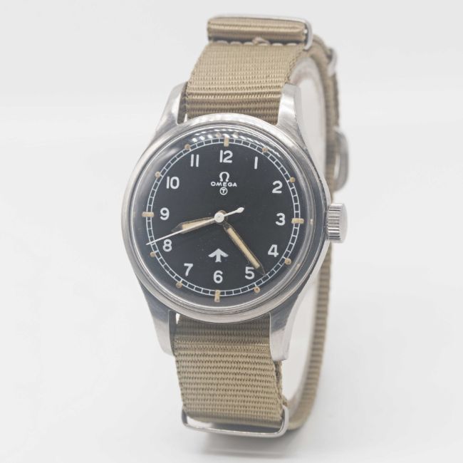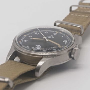 A GENTLEMAN'S STAINLESS STEEL BRITISH MILITARY OMEGA RAF PILOTS WRIST WATCHDATED 1953, REF. 2777-1 SC WITH "FAT ARROW" DIALMovement: 17J, manual wind, cal. 283, signed Omega, numbered 13,xxx,xxx.Case: Diameter approx. 37mm, fixed bars, screw back, signed Omega Watch Co, issue markings ^ 6645 101000 6B/542 3440/53, dust cover, inner ring.Strap: NATO.CONDITION REPORTDial: Original dial in very good condition, showing small signs of age.Movement: Running at present.Case: In excellent condition, with some small scratches due to use.Strap/Bracelet: In excellent condition.The timekeeping and accuracy of this watch has not been tested, therefore cannot be guaranteed.