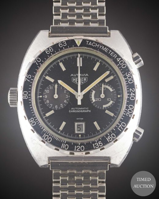 Case: Width approx. 42mm, screw back, signed Heuer-Leonidas SA, patent numbers, signed M.R.P. S.A with case ref. 503.305, numbered 39x,xxx, tachymetre rotating bezel, mineral glass, Heuer crown & pushers.