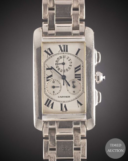 Case: Approx. 45mm by 26mm, curved case, signed Cartier, numbered, 18k hallmarks, sapphire crown.