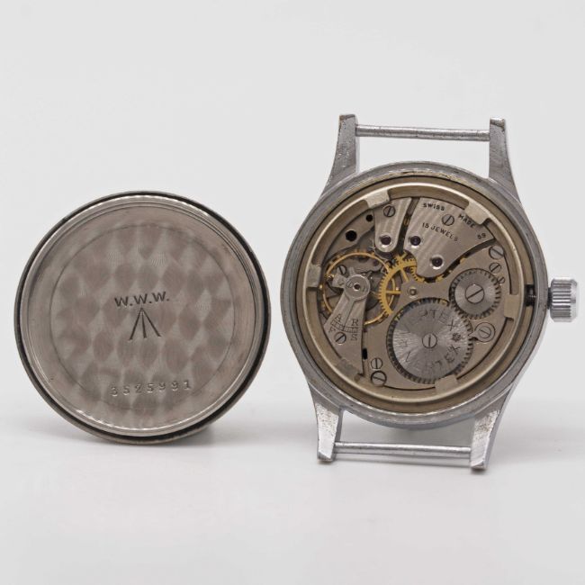 Case: Diameter approx. 36mm, fixed bars, nickel plated case with steel screw back, issue markings W.W.W. ^ A 13075 3525991, lug numbered 075.
