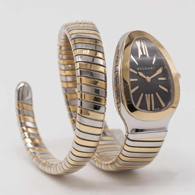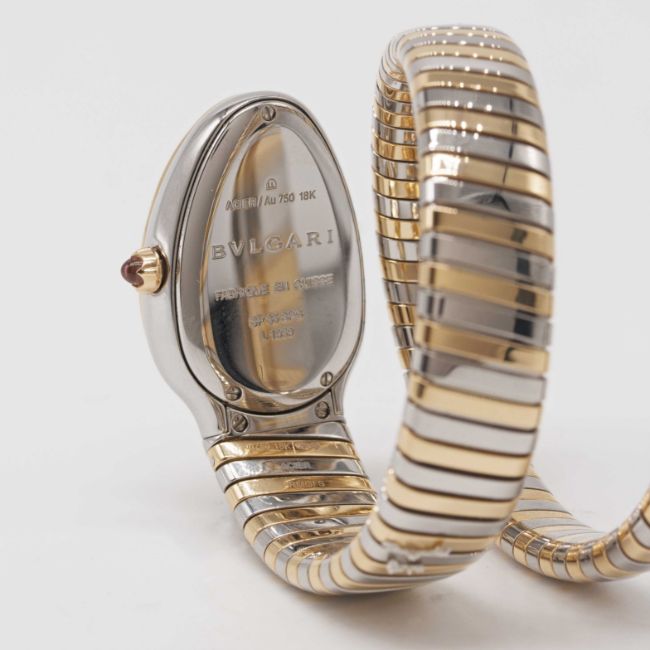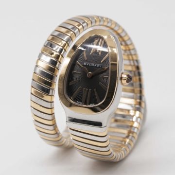 A LADIES STEEL & GOLD BULGARI SERPENTI TUBOGAS SINGLE SPIRAL BRACELET WATCH