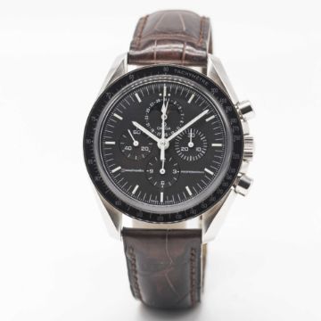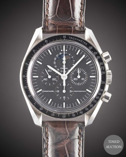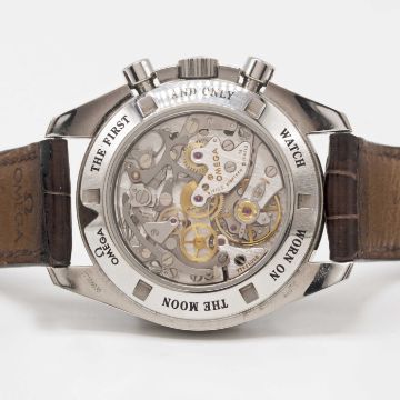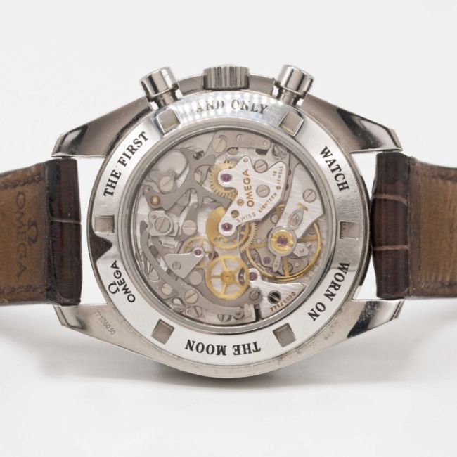 Case: Diameter approx. 42mm, screw back, sapphire exhibition back with engraving to edge 'The First And Only Watch Worn On The Moon', signed Omega, numbered 77,xxx,xxx, tachymetre bezel, Omega crown.