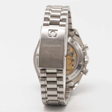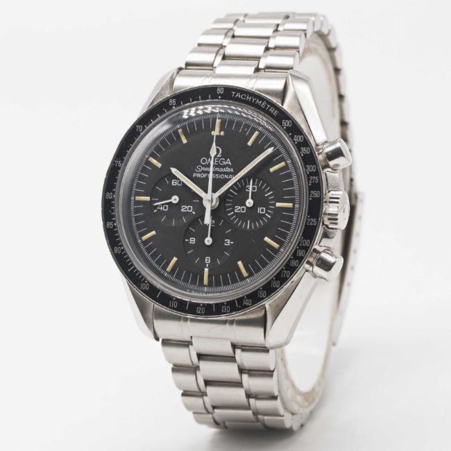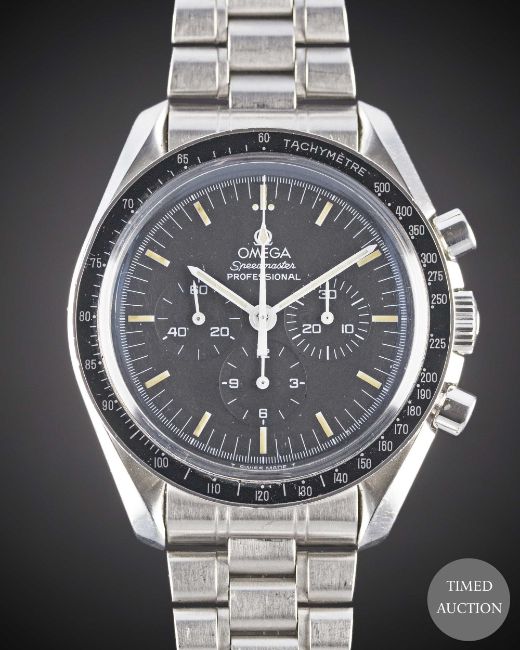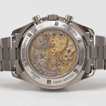 Case: Diameter approx. 42mm, screw back, sapphire exhibition back with engraving to edge 'First Watch Worn on the Moon', signed Omega, numbered 48,xxx,xxx, tachymetre bezel, Omega crown.