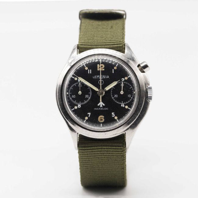 A GENTLEMAN'S STAINLESS STEEL BRITISH MILITARY LEMANIA SINGLE BUTTON RAF PILOTS CHRONOGRAPH WRIST WATCH