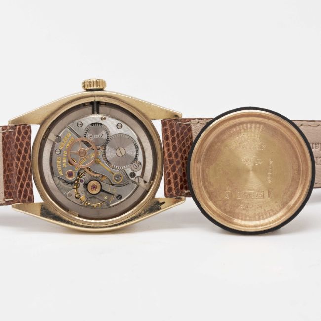 Case: Diameter approx. 34mm, Oyster case, signed Montres Rolex S.A, marked R.W.C. Ltd, 9ct hallmarks, numbered 48x,xxx, Rolex crown.