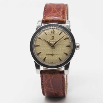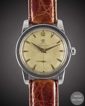 Movement: 17J, "bumper" automatic, cal. 344, signed Omega Watch Co, numbered 13,xxx,xxx.