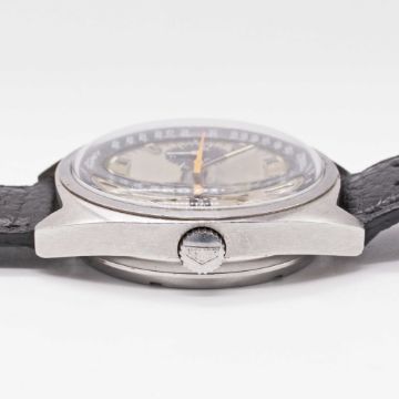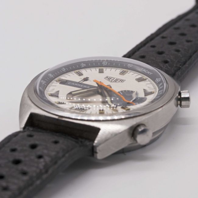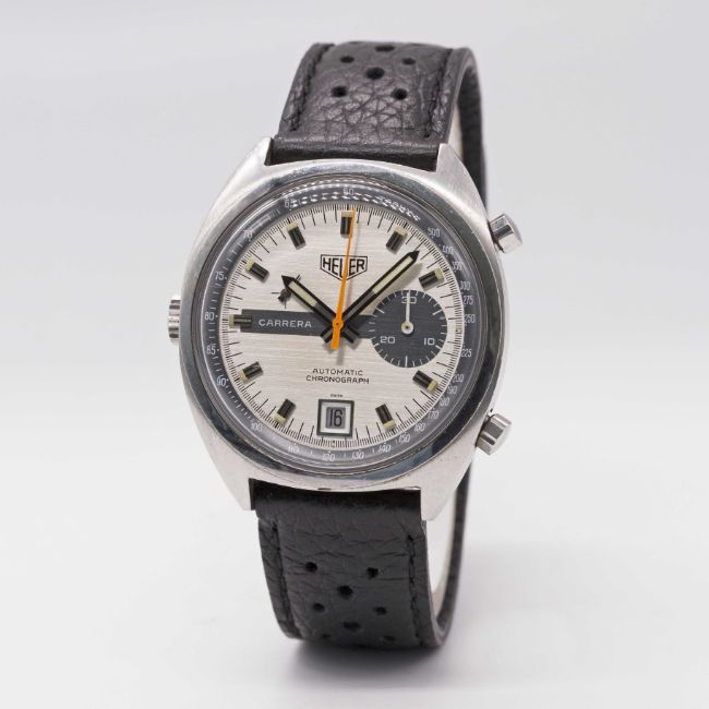 A GENTLEMAN'S STAINLESS STEEL HEUER CARRERA AUTOMATIC CHRONOGRAPH WRIST WATCHCIRCA 1970s, REF. 1553S WITH BRUSHED SILVER DIALMovement: 17J, automatic, cal. 15, signed Heuer.Case: Width approx. 38mm, screw back, signed Heuer-Leonidas SA, numbered 29x,xxx, numbered C P1xx-x to case back, Heuer crown & pushers.Strap: Perforated leather.CONDITION REPORTDial: Original dial in excellent condition, showing some small signs of age.Movement: Running & functioning at present, timekeeping and accuracy cannot be guaranteed.Case: In very good condition, with some small scratches due to general use.Strap/Bracelet: In excellent condition.