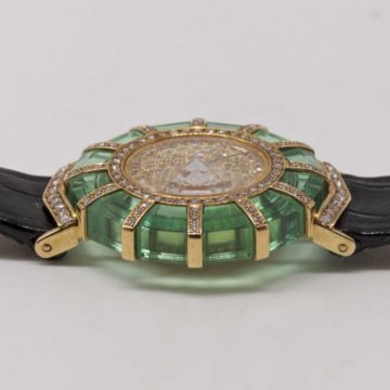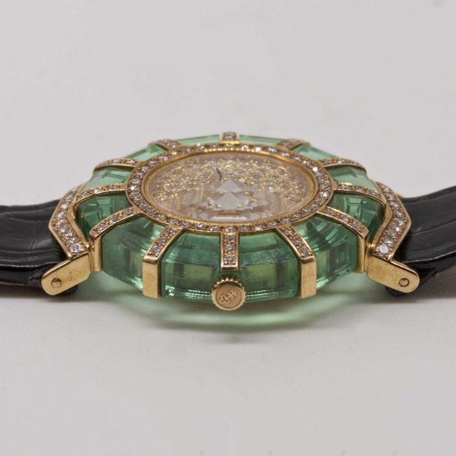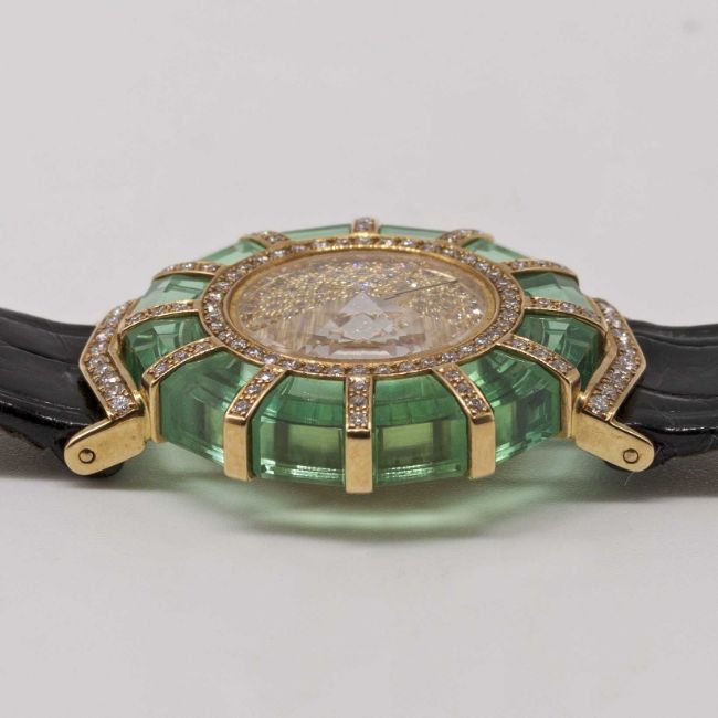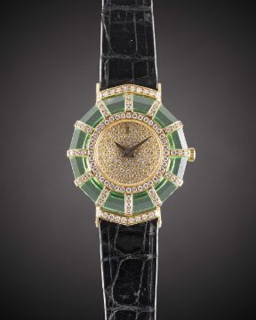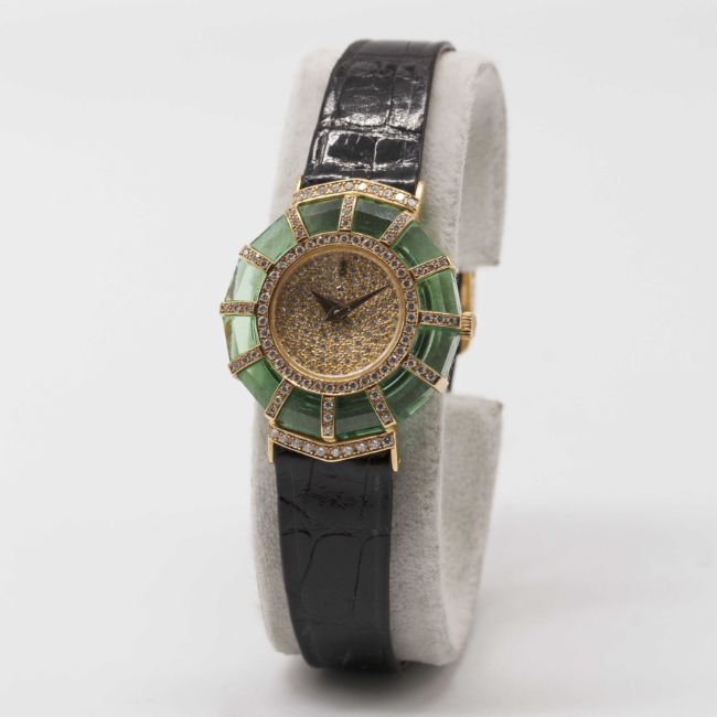 A LADIES 18K SOLID GOLD, DIAMOND & GREEN CRYSTAL CORUM PRINCESS LIMELIGHT WRIST WATCHCIRCA 1990s, REF. 24.882.65 WITH ORIGINAL PAVÉ SET DIAMONDSMovement: Quartz.Case: Diameter approx. 26mm, dodecagonal case with original set diamonds & green crystal, signed Corum Princess Limelight, numbered, 18k hallmarks, Corum crown.Strap: Original Corum leather strap & 18k solid gold pin buckle.CONDITION REPORTDial: Original dial in excellent condition.Movement: Running & functioning at present, timekeeping and accuracy cannot be guaranteed.Case: In excellent condition, with some light scratches due to general use.Strap/Bracelet: In excellent condition.