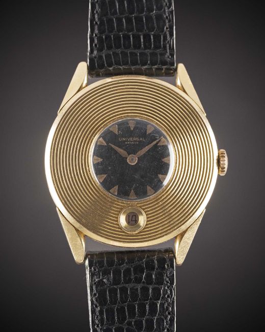 A RARE GENTLEMAN'S 18K SOLID ROSE GOLD UNIVERSAL GENEVE "DISCO VOLANTE" CALENDAR WRIST WATCHCIRCA 1950s, REF. 100110 1 WITH "MINI" GLOSS BLACK GILT DIAL Movement: 17J, "bumper" automatic, cal. 138C, signed Universal Geneve.Case: Diameter approx. 34.5mm, wide bezel with concentric circle pattern & date aperture, snap back, signed Universal Geneve, 18k hallmarks, numbered 1,7xx,xxx.Strap: Must de Cartier leather strap & pin buckle.CONDITION REPORTDial: Original dial in excellent condition.Movement: Running & functioning at present, timekeeping and accuracy cannot be guaranteed.Case: In excellent condition, with some light scratches due to general use.Strap/Bracelet: In good condition.