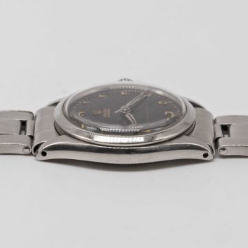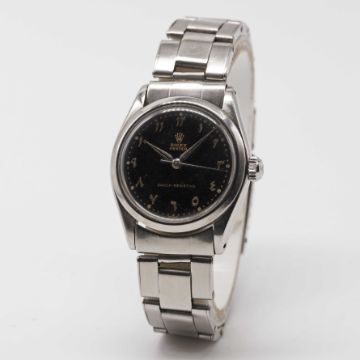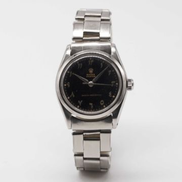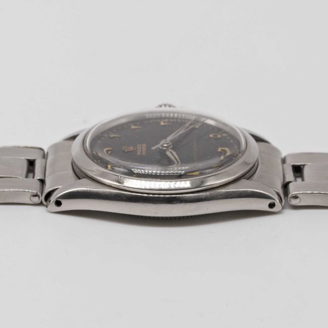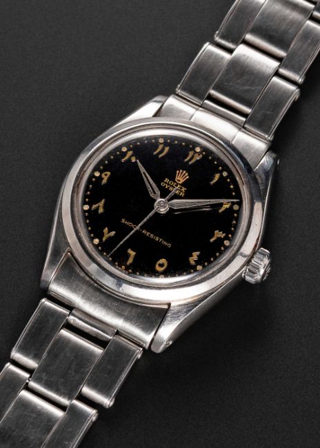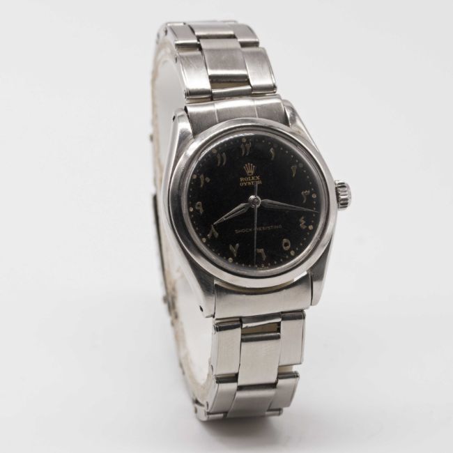 AN EXTREMELY RARE GENTLEMAN'S STAINLESS STEEL ROLEX OYSTER BRACELET WATCHCIRCA 1963, REF. 6430 WITH GLOSS BLACK GILT "ARABIC" DIAL FEATURING NUMERALS IN ARABIC-HINDI SCRIPTMovement: 17J, manual wind, cal. 1215, signed Montres Rolex SA, numbered.Case: Diameter approx. 30.5mm, Oyster case, signed Montres Rolex S.A., dated I.63, numbered 84x,xxx, Rolex crown.Bracelet: Unsigned riveted "Oyster" bracelet, end links numbered 51.CONDITION REPORTDial: Original dial in excellent condition, showing some small signs of age.Movement: Running & functioning at present, timekeeping and accuracy cannot be guaranteed.Case: In excellent condition, with some small scratches to case back due to general use.Strap/Bracelet: In fair condition.