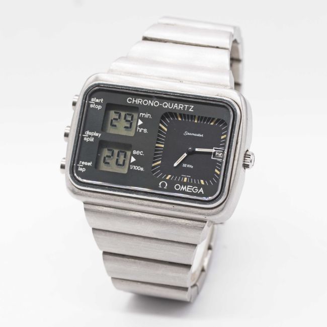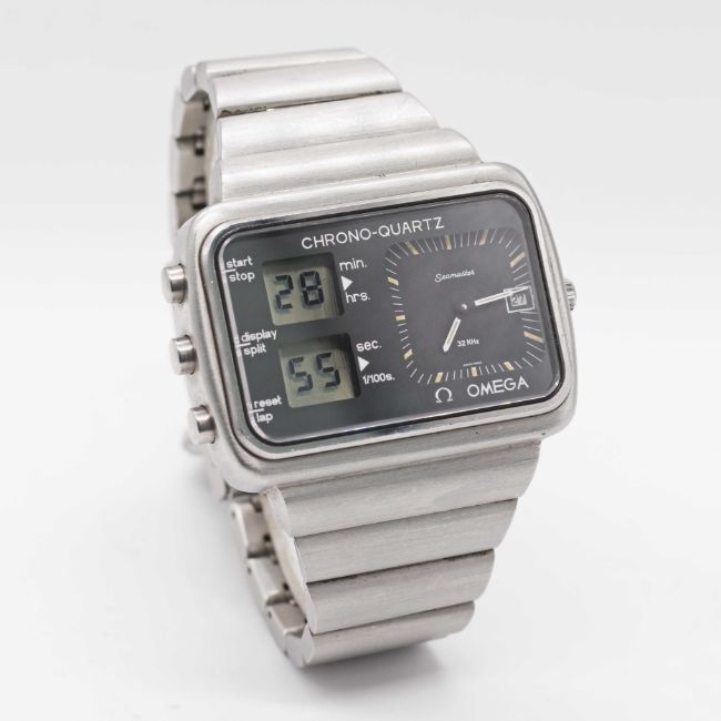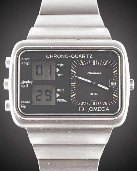 A GENTLEMAN'S STAINLESS STEEL OMEGA SEAMASTER MONTREAL "SCOREBOARD" CHRONO-QUARTZ BRACELET WATCHCIRCA 1976, PRODUCED FOR THE 1976 MONTREAL OLYMPIC GAMESMovement: Quartz, cal. 1611, signed Omega.Case: Width approx. 47mm, Olympic crest & Seamaster emblem embossed on case back, signed Omega Watch Co.Bracelet: Original Omega bracelet, numbered (11) ST. 1277/212.CONDITION REPORTDial: Original dial in excellent condition.Movement: Running & functioning at present, timekeeping and accuracy cannot be guaranteed.Case: In excellent condition, with some light scratches due to general use.Strap/Bracelet: In excellent condition, with some light scratches due to general use.