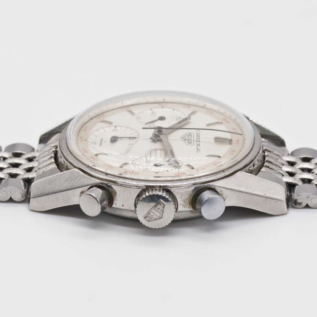 A RARE GENTLEMAN'S STAINLESS STEEL HEUER CARRERA CHRONOGRAPH BRACELET WATCHCIRCA 1960s, REF. 2447T WITH TWO TONE SILVER DIAL & RED TACHYMETRE SCALEMovement: 17J, manual wind, Valjoux cal. 72, signed Heuer-Leonidas SA.Case: Diameter approx. 36mm, screw back, signed Heuer-Leonidas SA, numbered 79,xxx, Heuer crown.Bracelet: Prima-Plana "BoR" bracelet.CONDITION REPORTDial: Original dial in good condition, showing small signs of age.Movement: Running & functioning at present, timekeeping and accuracy cannot be guaranteed.Case: In good condition, with small scratches due to general use.Strap/Bracelet: In fair condition, with some scratches & wear due to general use.