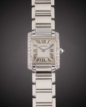 A LADIES 18K SOLID WHITE GOLD & DIAMOND CARTIER TANK FRANCAISE BRACELET WATCHCIRCA 2005, REF. 2403 WITH CARTIER BOX Movement: Quartz, signed Cartier.Case: Width approx. 20.5mm, signed Cartier, numbered, 18k hallmarks, after-set diamond shoulders, sapphire crown.Bracelet: Original 18k solid white gold Cartier bracelet.CONDITION REPORTDial: Original dial in excellent condition.Movement: Running & functioning at present, timekeeping and accuracy cannot be guaranteed.Case: In excellent condition.Strap/Bracelet: In excellent condition.