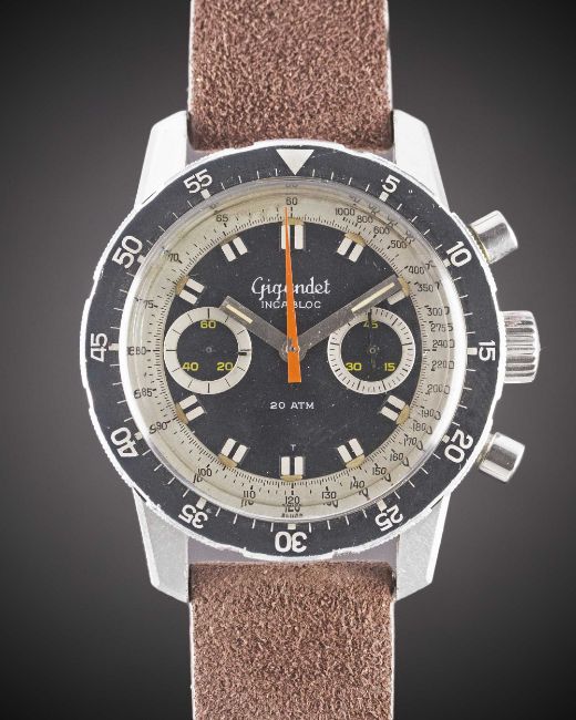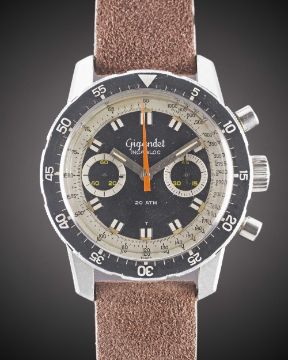 A GENTLEMAN'S STAINLESS STEEL GIGANDET "BIG BOY" CHRONOGRAPH WRIST WATCHCIRCA 1968, REF. 1382 WITH BLACK DIAL & "LICORICE ALLSORT' MARKERSMovement: 17J, manual wind, Landeron cal. 248.Case: Diameter approx. 41mm, screw back, signed Charles Gigandet, numbered, 60 minute rotating bezel.Strap: Suede.CONDITION REPORTDial: Original dial in very good condition, outer tachymetre scale showing small signs of age.Movement: Running & functioning at present, timekeeping and accuracy cannot be guaranteed.Case: In very good condition, with small scratches due to general use.Strap/Bracelet: In excellent condition.