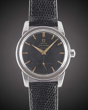A GENTLEMAN'S STAINLESS STEEL OMEGA SEAMASTER AUTOMATIC WRIST WATCHCIRCA 1956, REF. 2846 / 2848 6 SC GLOSS BLACK GILT DIAL Movement: 20J, automatic, cal. 503, signed Omega Watch Co, numbered 15,xxx,xxx. Case: Diameter approx. 34mm, "waterproof" snap back, signed Omega Watch Co, Omega crown.Strap: Leather.CONDITION REPORTDial: Original dial in very good condition, showing small signs of age.Movement: Running & functioning at present, timekeeping and accuracy cannot be guaranteed.Case: In very good condition, with light scratches due to general use.Strap/Bracelet: In excellent condition.