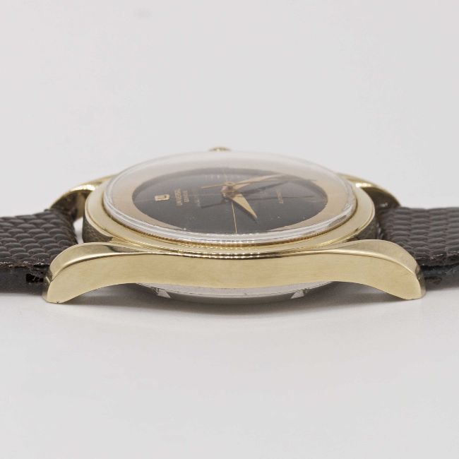 A RARE GENTLEMAN'S GOLD CAPPED UNIVERSAL GENEVE POLAROUTER WRIST WATCHCIRCA 1954, REF. 20214-1 WITH GLOSS BLACK GILT CROSSHAIR DIAL, MADE FOR A SHORT PERIOD OF TIME BEFORE THE CHANGE OF SPELLING TO POLEROUTER, ACCOMPANIED BY UNIVERSAL GENEVE BOXMovement: 17J, "bumper" automatic, cal. 138SS, signed Universal Geneve.Case: Diameter approx. 35mm, "lyre" lugs, stainless steel "waterproof" screw back, signed Universal Geneve with emblem embossed on case back, maker's mark HF, numbered 1,6xx,xxx.Strap: JB Champion leather strap with gold capped UG pin buckle.CONDITION REPORTDial: Original dial in excellent condition, showing some small signs of age.Movement: Running & functioning at present, timekeeping and accuracy cannot be guaranteed.Case: In excellent condition, with some light scratches due to general use.Strap/Bracelet: In excellent condition.