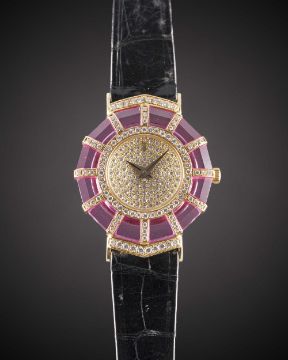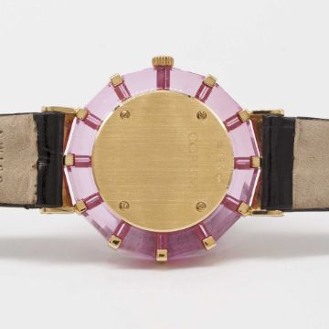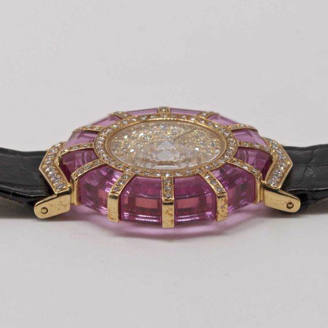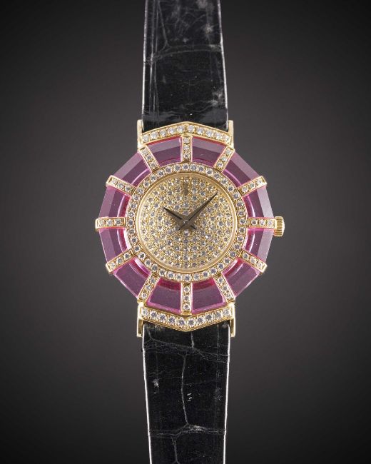 A LADIES 18K SOLID GOLD, DIAMOND & PINK CRYSTAL CORUM PRINCESS LIMELIGHT WRIST WATCHCIRCA 1990s, REF. 24.884.65 WITH ORIGINAL PAVÉ SET DIAMONDSMovement: Quartz.Case: Diameter approx. 26mm, dodecagonal case with original set diamonds & pink crystal, signed Corum Princess Limelight, numbered, 18k hallmarks, Corum crown.Strap: Original Corum leather strap & 18k solid gold pin buckle.CONDITION REPORTDial: Original dial in excellent condition.Movement: Running & functioning at present, timekeeping and accuracy cannot be guaranteed.Case: In excellent condition, with some light scratches due to general use.Strap/Bracelet: In excellent condition.