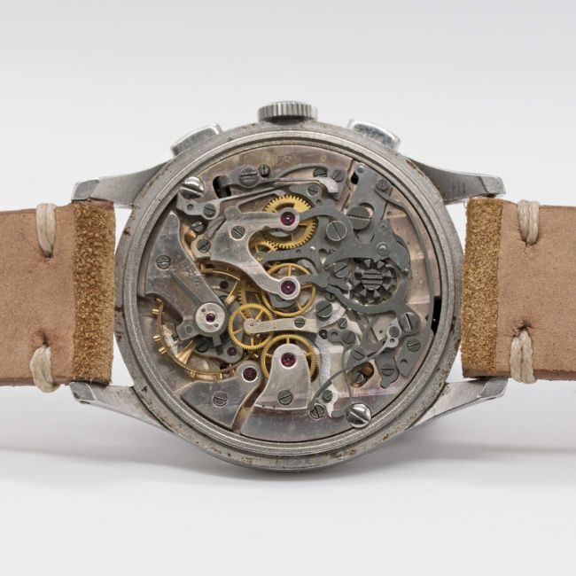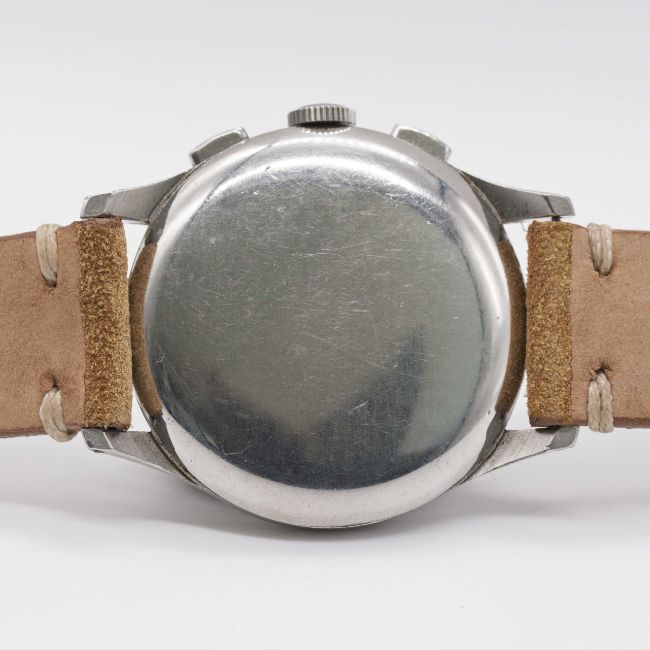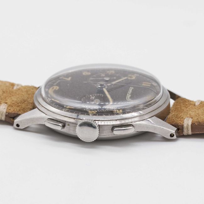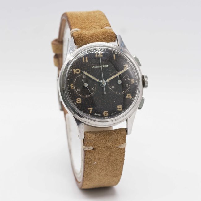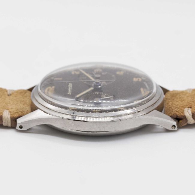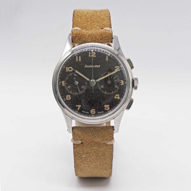 A GENTLEMAN'S STAINLESS STEEL EXCELSIOR PARK CHRONOGRAPH WRIST WATCHCIRCA 1950s, WITH GLOSS BLACK "TROPICAL" DIAL Movement: Manual wind, Excelsior Park calibre EP4.Case: Diameter approx. 36mm, "stepped" bezel, snap back, numbered 85x,xxx.Strap: Suede.