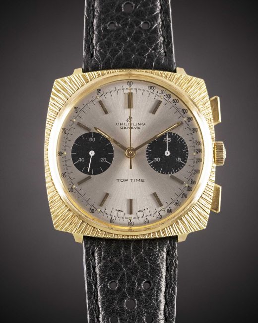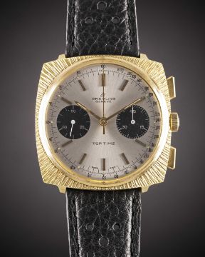 A GENTLEMAN'S GOLD PLATED BREITLING TOP TIME CHRONOGRAPH WRIST WATCHCIRCA 1966, REF. 2009 WITH "PANDA" DIALMovement: 17J, manual wind, Valjoux cal. 7730, signed Breitling Watch Ltd. Case: Width approx. 37mm, sunburst design, steel snap back, signed Breitling, numbered 1,1xx,xxx, Breitling crown.Strap: Perforated leather.CONDITION REPORTDial: Original dial in excellent condition.Movement: Running & functioning at present, timekeeping and accuracy cannot be guaranteed.Case: In excellent condition, with some light scratches due to general use.Strap/Bracelet: In excellent condition.